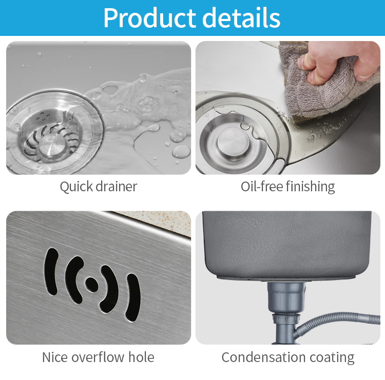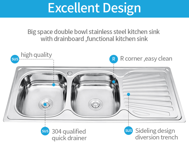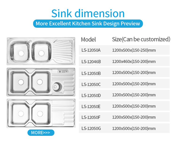 يمكن تخصيص الحجم 1200 * 500 مم ، 48 * 20 بوصة ، العمق والسماكة.تصميم وعاء مزدوج مع لوح تصريف.الآن سطح العينة هذا ذو تشطيب غير لامع يسمى "Pearl Sand ".نحن نقبل التشطيبات الأخرى المخصصة مثل التلميع والمصقول.يمكن تثبيت هذا النموذج على الحامل كمطبخ بسيط للاستخدام العائلي أو مطبخ تجاري.لتلبية طلبات العملاء المختلفة ، استكشفنا 10 تصميمات مختلفة لهذا الحجم.